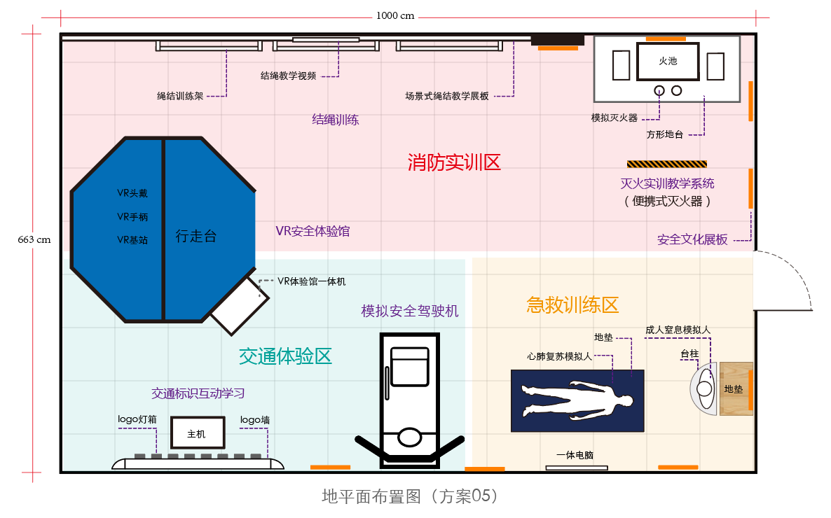 实训馆主要设施及项目包括醉酒行走体验项目、结绳训练、VR安全体验项目、交通标识互动学习项目、安全模拟驾驶项目、灭火实训教学系统和海姆立克训练七大板块。整个过程寓教于乐,通过完善的信息化基础设施和专业的教学设备,“场景式+情景式+体验式”的教育方式,使之成为避灾避险培训和体验的一站式场所,以期全面提升真人娱乐城