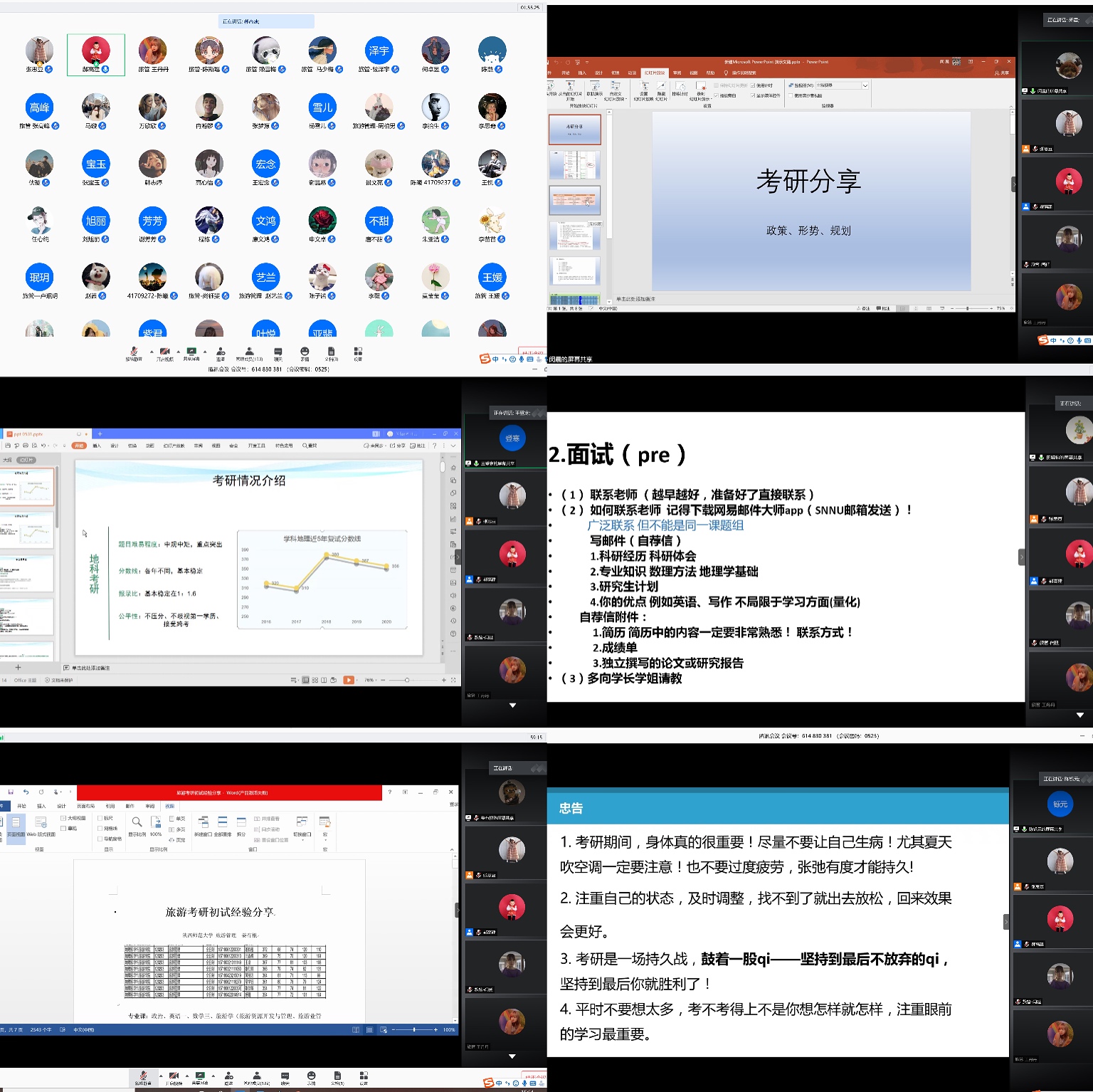 学科教学(地理)专业,她从笔试的试题类型、逻辑框架、参考书目、学习计划等方面为同学们提供复习指导。陈铄元同学今年以优异的成绩考取中科院地环所,她谈到,考研最重要的就是控制自己的节奏,要保证平稳的心态和良好的精神状态,同时她分享了几个高效复习的APP软件。姜有根同学今年考取了真人娱乐城