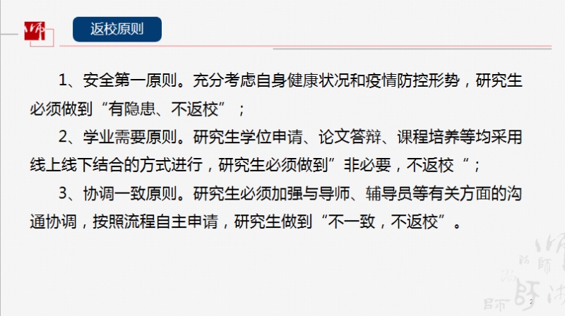 2020年春季学期学生开学工作会议精神,对研究生开学工作安排做了说明,明确了学生返校时间及返校要求,从学生返校原则、返校时间、返校须知、基本流程、温馨提示、应急处置及注意事项等7个方面做了说明。