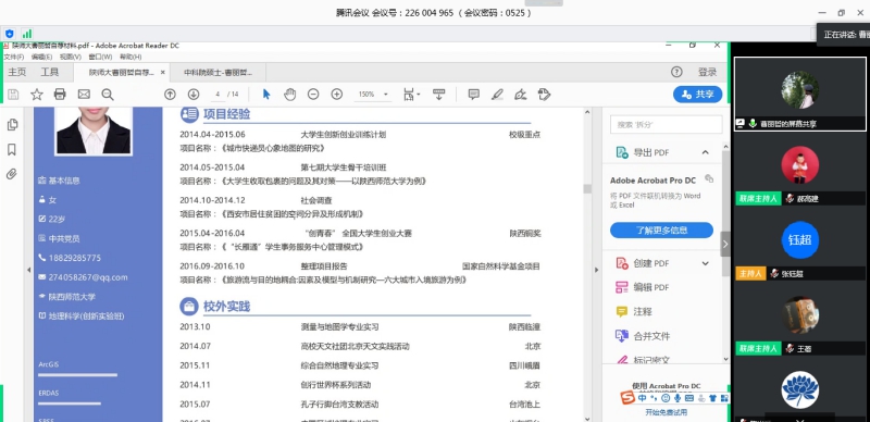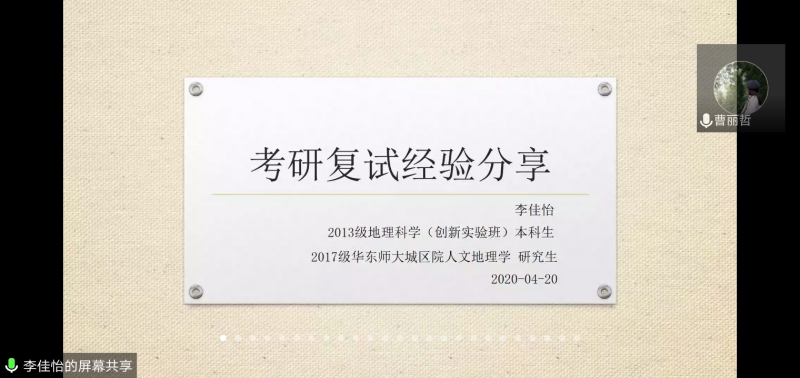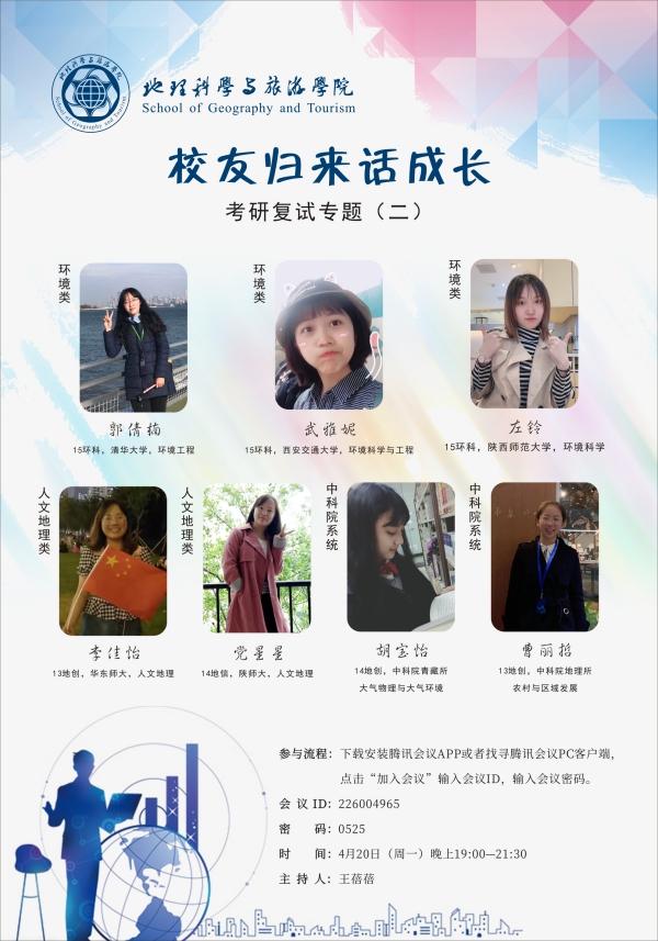 2013级地理科学创新班李佳怡(就读于华东师范大学)、14级地理信息科学党星星(就读于陕师大)、2013级地理科学创新班曹丽哲(就读于中科院地理所)、2014级地理科学创新班胡宝怡(就读于中科院青藏所)、2015级环境科学郭倩楠(就读于清华大学)、2015级环境科学武雅妮(就读于西安交通大学)、2015级环境科学左铃(就读于陕师大)等7位优秀校友在线分享。真人娱乐城