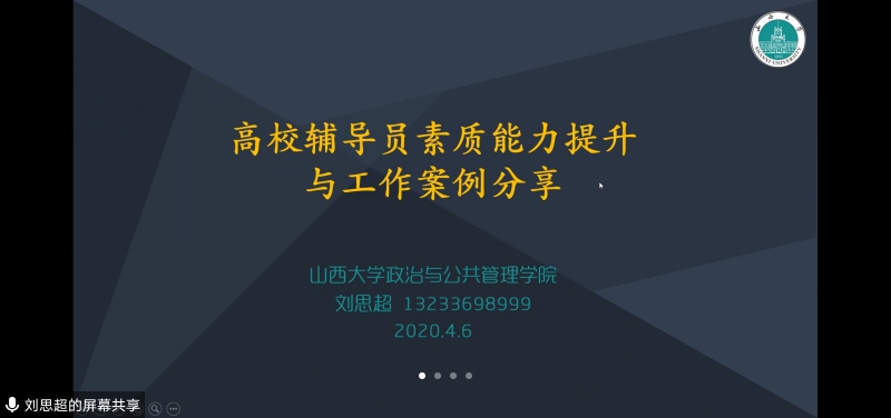 4月6日晚,“经纬”辅导员工作室举行“高校辅导员素质能力提升与工作案例分享”线上学习会。山西大学政治与公共管理真人娱乐城