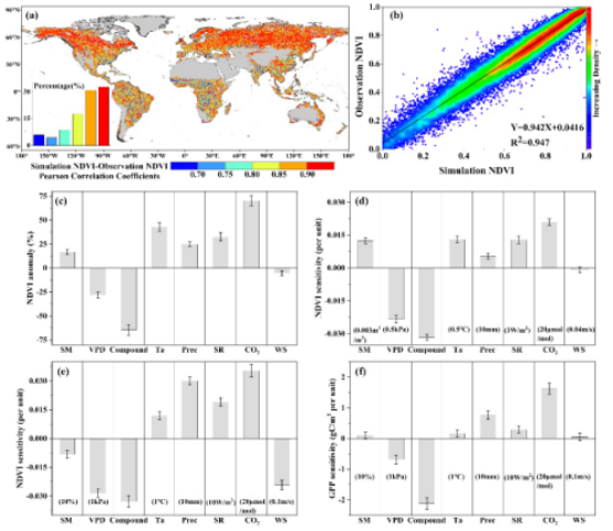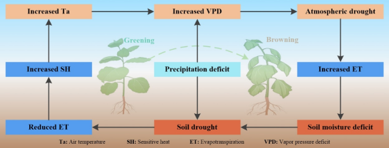 定量揭示植被生长对干旱的响应对于准确理解和预测陆地生态系统碳汇功能至关重要。20世纪80年代以来,全球植被总体呈现增加趋势,但全球总体变绿背景下,90年代中后期全球多地出现植被长势下降现象(植被褐变),一部分学者将其归因于大气干旱,而另一部分学者将其归因于土壤干旱。然而,大气干旱和土壤干旱通过陆-气耦合过程形成复合干旱,其影响将超过任何单一干旱类型,当前关于复合干旱对全球植被褐变的影响仍不清楚。为解决该问题,本文综合利用Flux站点观测、遥感观测和CMIP6模型数据,系统分析了干旱及其复合干旱的变化趋势及热点区域,并通过构建植被长势和生产力模型,量化了不同影响因素对植被长势和生产力的贡献,揭示出大气和土壤复合干旱在全球植被褐变过程中的主导作用,指出了当前地球系统模型在刻画复合极端事件及其影响评估方面的不足,为模型改进和提高模型预测准确性提供关键支撑。