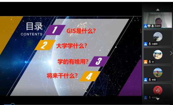 万剑华教授做了题为《信息化时代,地理信息科学(GIS)专业人才大有可为》的报告;第二阶段,针对学生关注的问题,地信专业教师和学生进行了线上交流。