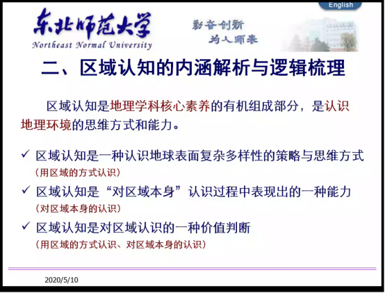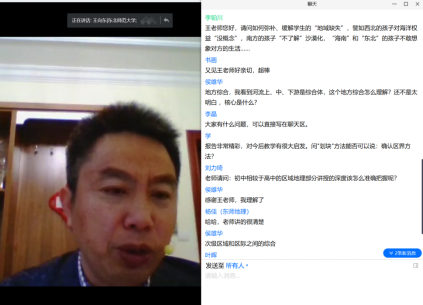 针对区域认知的内涵解析与逻辑梳理王教授讲到:培养学生的地理核心素养必须回归到中国学生发展基本素养。阐明了区域认知不仅是地理核心素养更体现出中国学生发展素养当中的育人价值,通过地理学科的学习而逐渐形成正确的价值观念必备的品格关键的能力。这也是对知识与技能、过程与方法、情感态度与价值观的三维目标进行了整合与提升,王教授特别对情感态度与价值观进行了详细的讲解,对职前教师以及在职教师存在的问题进行了回答:地理教学不单纯为了培养地理学家,更要培养一个合格的人,学习地理最根本目的是让学生变成一个热爱祖国,热爱生活见多识广的人