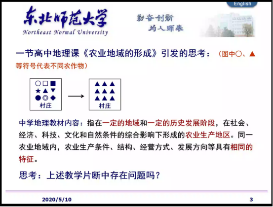 他选取了高中地理《农业地域的形成》一节内容,从农业地域形成过程的时间方面,尤其是在不同阶段的特点进行了拓展,说明了之前教学片段存在的缺失,之后又补充以东北地区商品谷物农业为例的尺度问题、农业地域当中并不包含一种农作物或一种农业生产活动的综合问题、农业地域往往不仅指行政地区,而是自然地区如河谷、山体、绿洲等的现实问题,最后又回归到地理教学的实践,发现教学片段中使用的符号非常见农作物符号或实物图例的规范问题