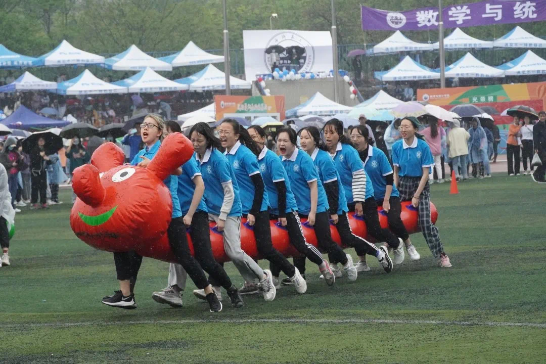 “鱼翔浅底,鹰击长空,蔚蓝地科,碧海苍穹!”嘹亮的口号响彻全场,展示着地科人“朝碧海而暮苍梧”的志向与抱负。虽是大雨天气,也难挡地科人如火的热情。