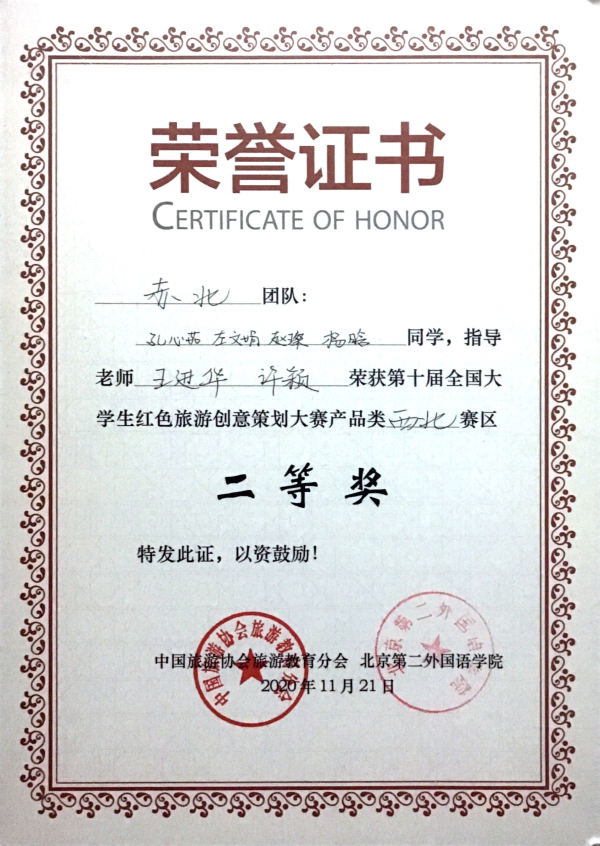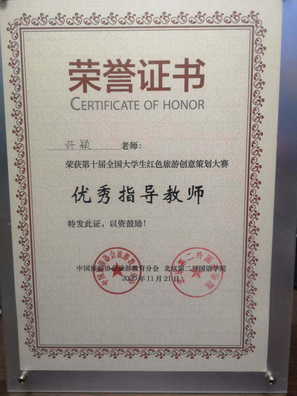 2019级旅游管理专业孔心茹等同学的作品荣获第十届全国大学生红色旅游创意策划大赛产品类西北赛区二等奖,许颖获得优秀指导教师,真人娱乐城