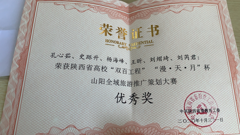 2019级旅游管理专业孔心茹、史跞升、杨海峰、王昕、刘熠琦、刘芮君等组成的团队在许颖老师的指导下,获得了陕西省高校“双百工程”“漫·天·月”杯山阳全域旅游推广策划大赛优秀奖,许颖老师获得优秀指导教师奖。