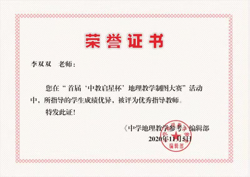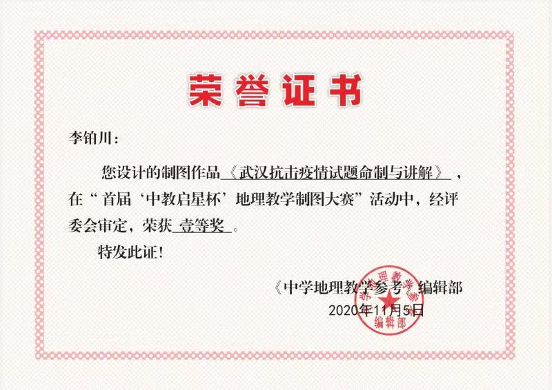 地理科学专业李铂川在李双双老师的指导下,通过精心准备和制作,设计的制图作品《武汉抗击疫情试题命制与讲解》获大赛一等奖。李双双老师被评为优秀指导教师。