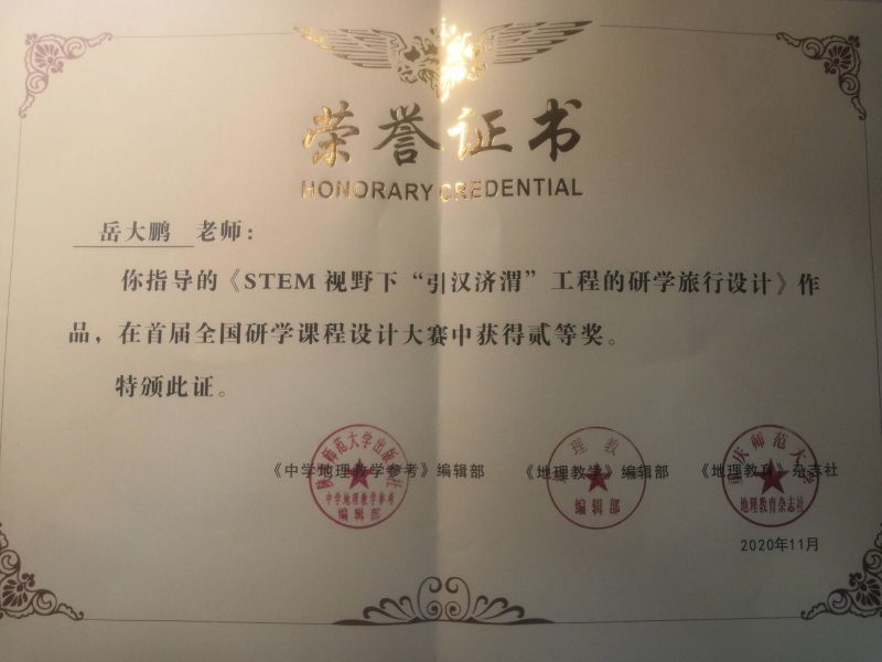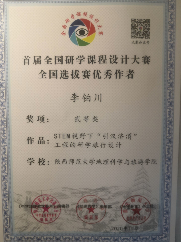 2018级地理科学专业李铂川在岳大鹏老师的指导下,设计的课程作品《STEM视野下“引汉济渭“工程的研学旅行设计》获大赛二等奖。