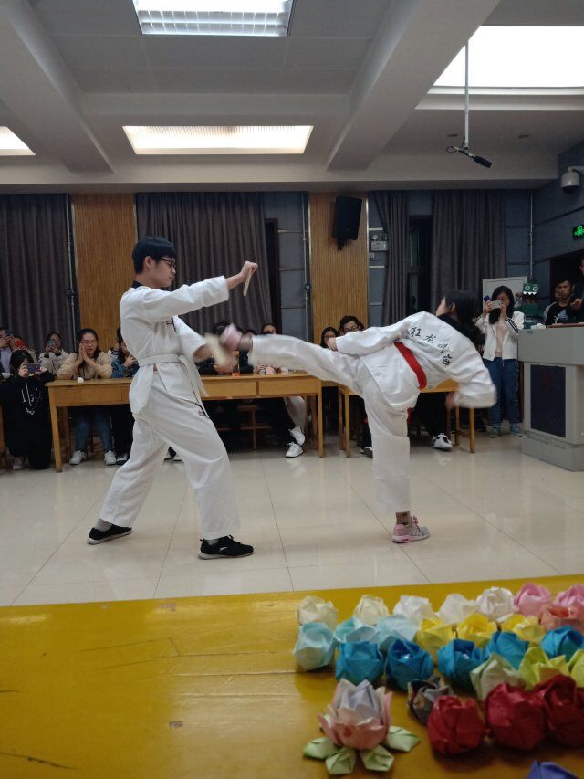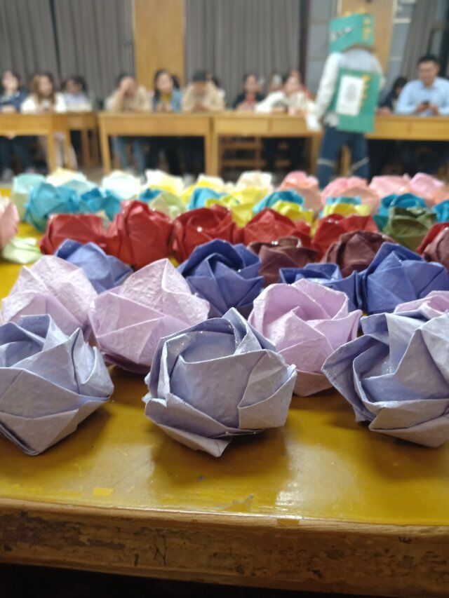活动主要分为三部分,内容充实,衔接得当。活动现场参加人员热情高涨,参与度极高。活动第一部分是兄弟社团的节目展示,雏玉散文社同学带来了诗朗诵《沁园春•雪》,感情充沛,引人入胜;狂龙武协依次展示了散打、跆拳道、双截棍,引来场上观众的阵阵喝彩欢呼;蓝草吉他社同学的一首《再见青春》弹唱,勾起同学们对青春的畅想;紫云相声社的演员们的用心表演,带动整个会场的氛围,同学们欢声笑语,掌声不断。第二部分是大学生礼仪社的环保时装展示及设计者的设计理念介绍,与第一部分穿插进行。伴随着音乐的节奏,礼仪社的同学们走出了自己的风采,充分展示出环保时装的魅力,激发同学们对环保事业的兴趣、宣传了绿色环保的理念。第三部分是现场教学:川崎玫瑰的手工制作。讲台上有手工部的部员教学,并有PPT的步骤展示,场下有多位部员现场指导,最后大部分同学们都叠出了自己的第一朵玫瑰花。