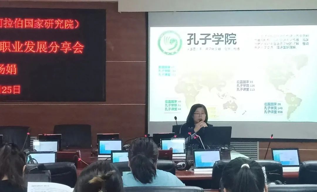 会议伊始,杨娟老师介绍了汉语国际教育的发展历程及学科教育体系以及国内外汉语教学机构,表示汉语国际教育已经得到了长足的发展;随后,对项目前景及待遇,阿拉伯与专业学生就业形势进行了分析;而后向同学们详细讲解了考取《国际中文教师证书》的资格条件,以及如何成功通过笔试面试。