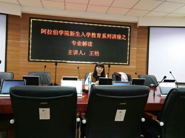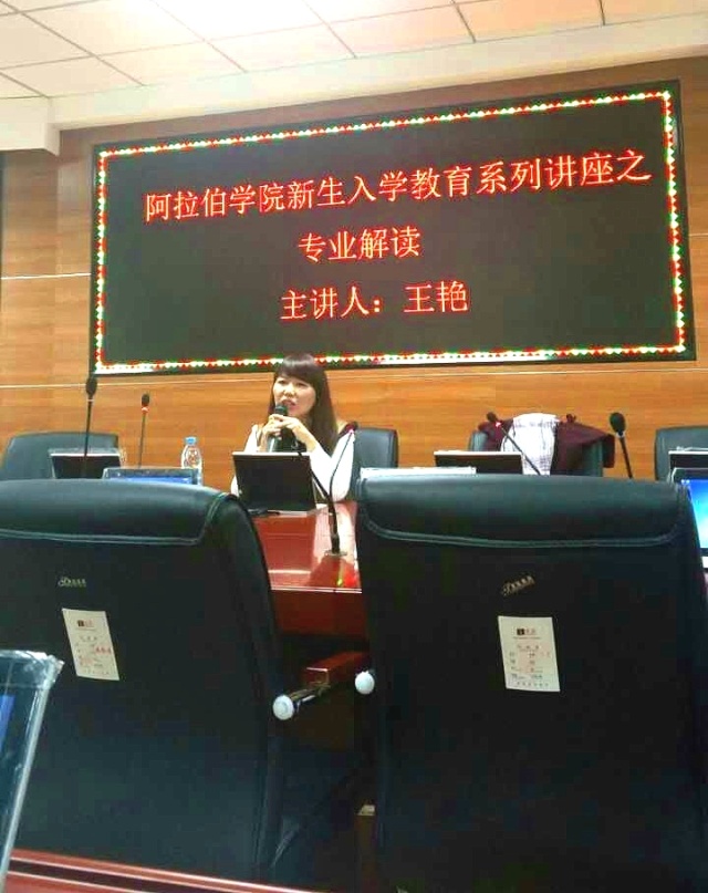 对于阿拉伯语的学习,她给同学们提出了以下几点建议:第一、从简单口语起步入手。简单但又长期坚持的口语表达,是打开阿拉伯语大门的最佳选择。第二、从朗读模仿胜人一筹。学阿拉伯语的必由之路是朗读,要出声朗读,还要去听录音模仿朗读,力求发音准确。第三、从演讲比赛找回自信。同学们要积极主动去参加一些演讲之类的比赛,用练习演讲和备战演讲学习阿语是一种上乘的学习方法,用比赛的方式找回在阿语学习中失去的自信心。第四、从文化之旅经历探求。阅读一些阿拉伯历史文化方面的书籍,同样一些文明古迹也可以当做学习阿语的工具。第五、平衡阿语专业和英语的学习。语言都是相通的,学好了英语可以帮助自己提升阿语的学习能力,也会在当今竞争极其激烈的社会上多一个获胜的筹码。