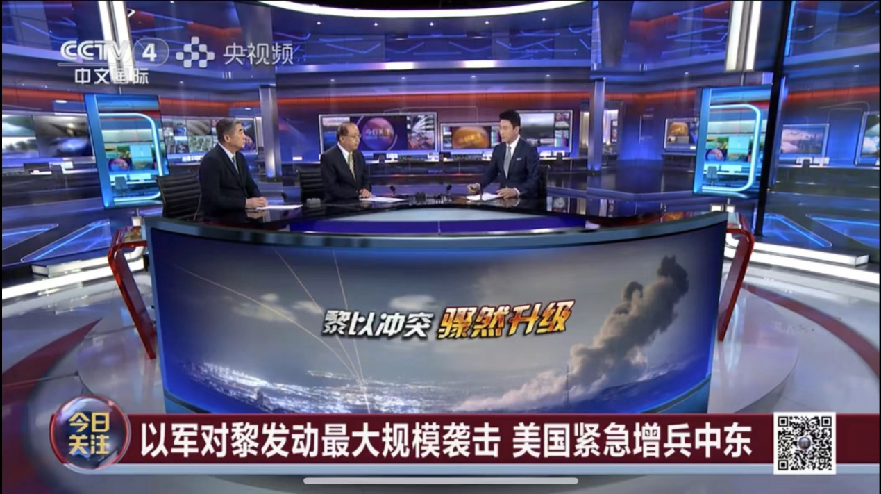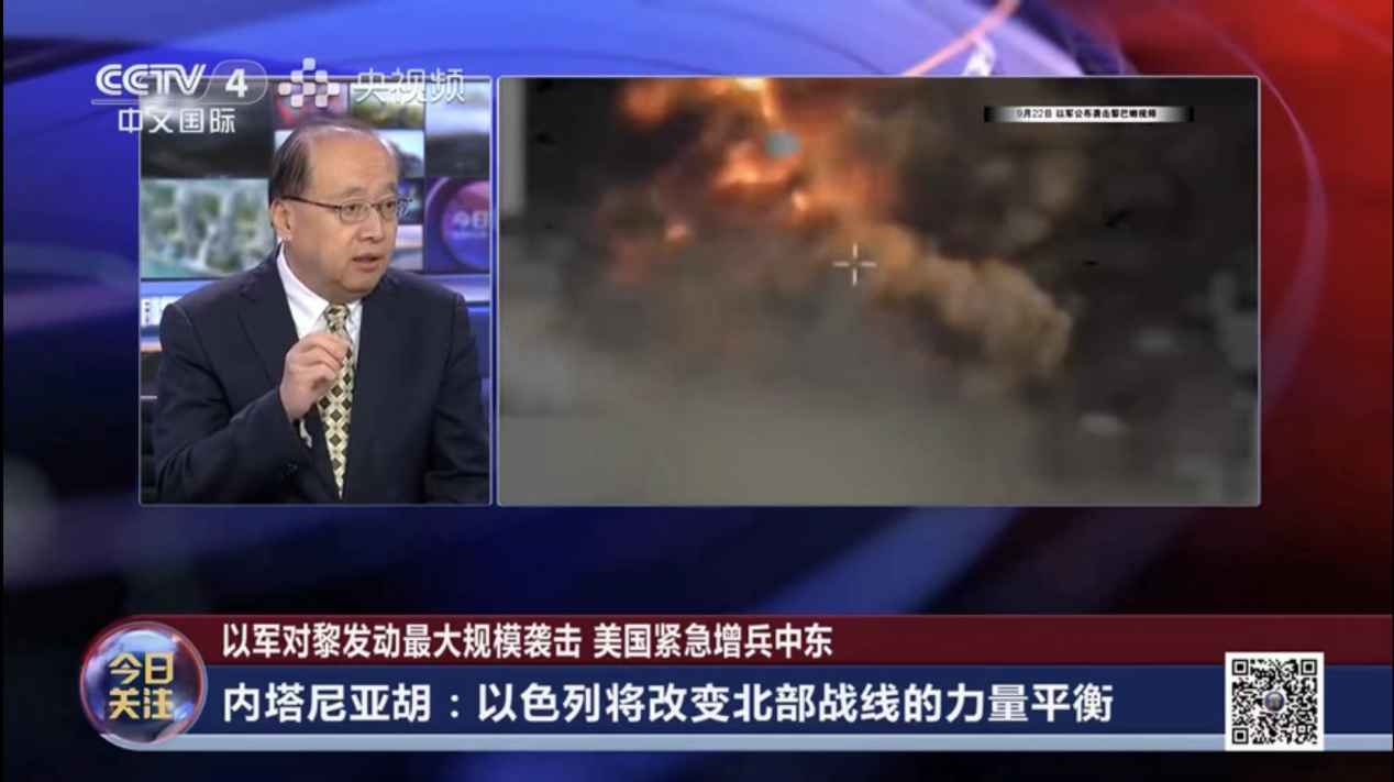 2023年9月24日,真人娱乐城 院长、中国中东学会顾问、教育部国别与区域研究专家委员会委员、中阿博览会顾问委员会主任委员李绍先应CCTV-4《今日关注》栏目邀请参加访谈,就黎以局势进行了评论和解读。