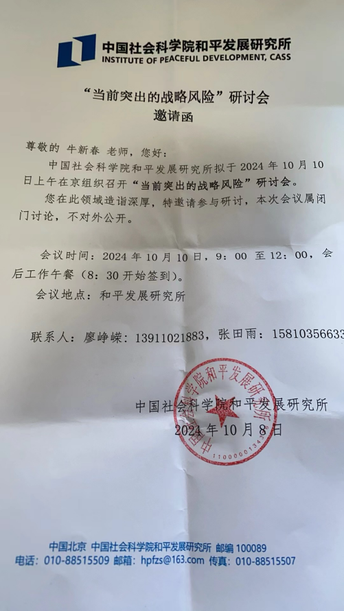 二、10月10日上午,应中国社会科真人娱乐城 和平发展研究所邀请,参加“当前突出的战略风险”研讨会并作重要发言。