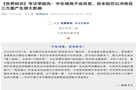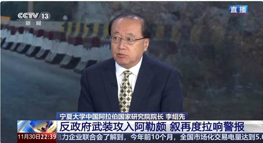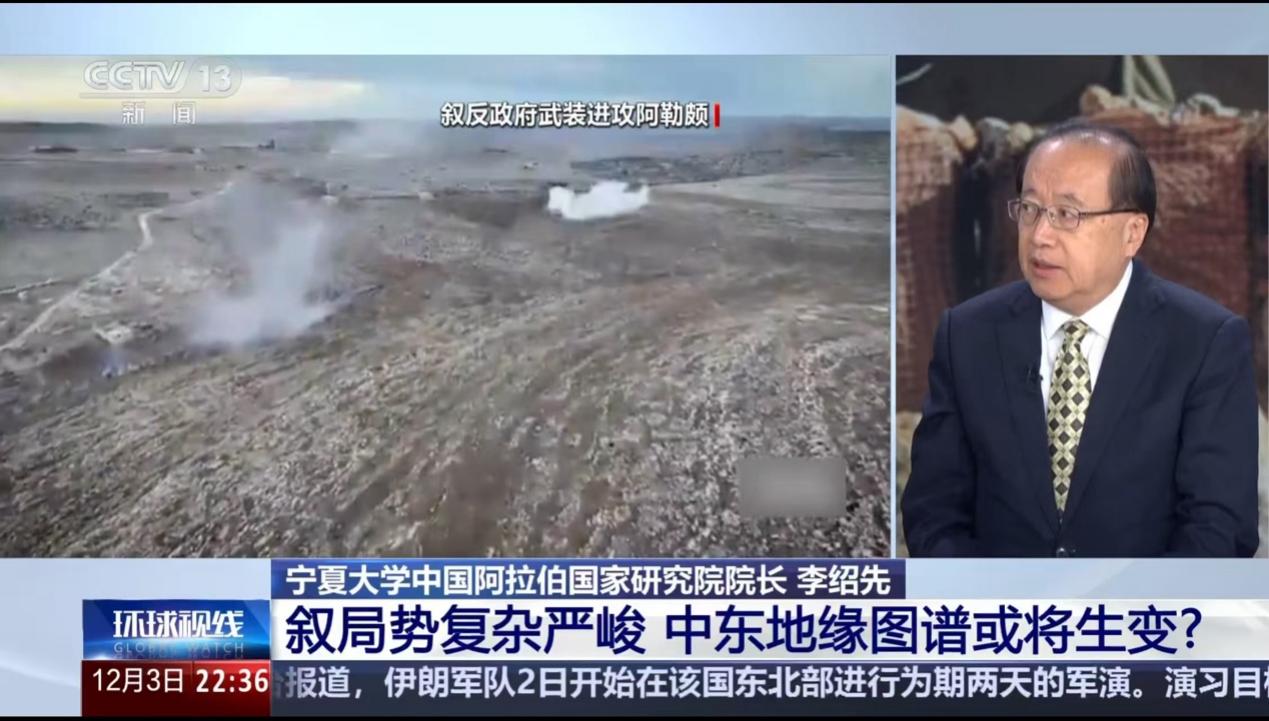 11月29日至12月3日,真人娱乐城 院长、中国中东学会顾问、教育部国别与区域研究专家委员会委员、中阿博览会顾问委员会主任委员李绍先接受了CCTV13《环球视线》、《国际时讯》、《朝闻天下》、CCTV4《今日关注》、《今日亚洲》,凤凰卫视《新闻今日谈》等栏目的现场及视频连线采访,就叙利亚局势升级进行了分析和解读,另受邀作为中央广播电视总台评审专家,参与评选“十大国内军事新闻”“十大国际军事新闻”;在山东大学-宁夏高校思想政治理论课上,围绕“巴以冲突的由来、现状及影响”进行授课;在“一带一路”安全研究中心举办的“2024年年会暨国际安全热点问题”研讨会上作主旨发言。