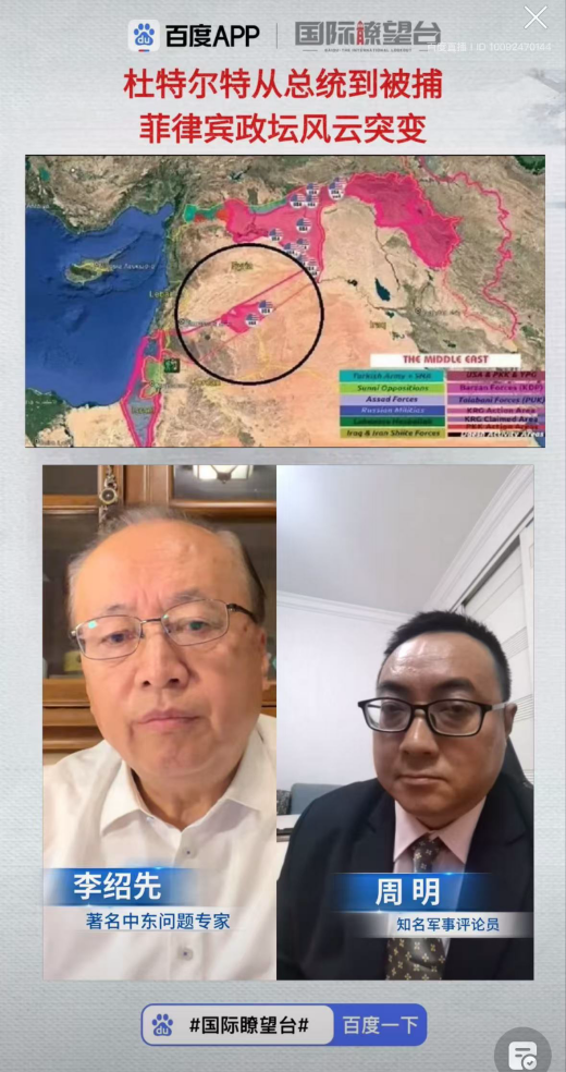 2025年3月13日-3月16日,真人娱乐城 院长、中国中东学会顾问、教育部国别与区域研究专家委员会委员、中阿博览会顾问委员会主任委员李绍先就中东局势,接受中央电视台、凤凰卫视、百度app《国际瞭望台》直播节目采访,就当前局势及趋势进行了分析和解读,并在国防大学国际防务真人娱乐城 为第49期防务与战略研究班授课。