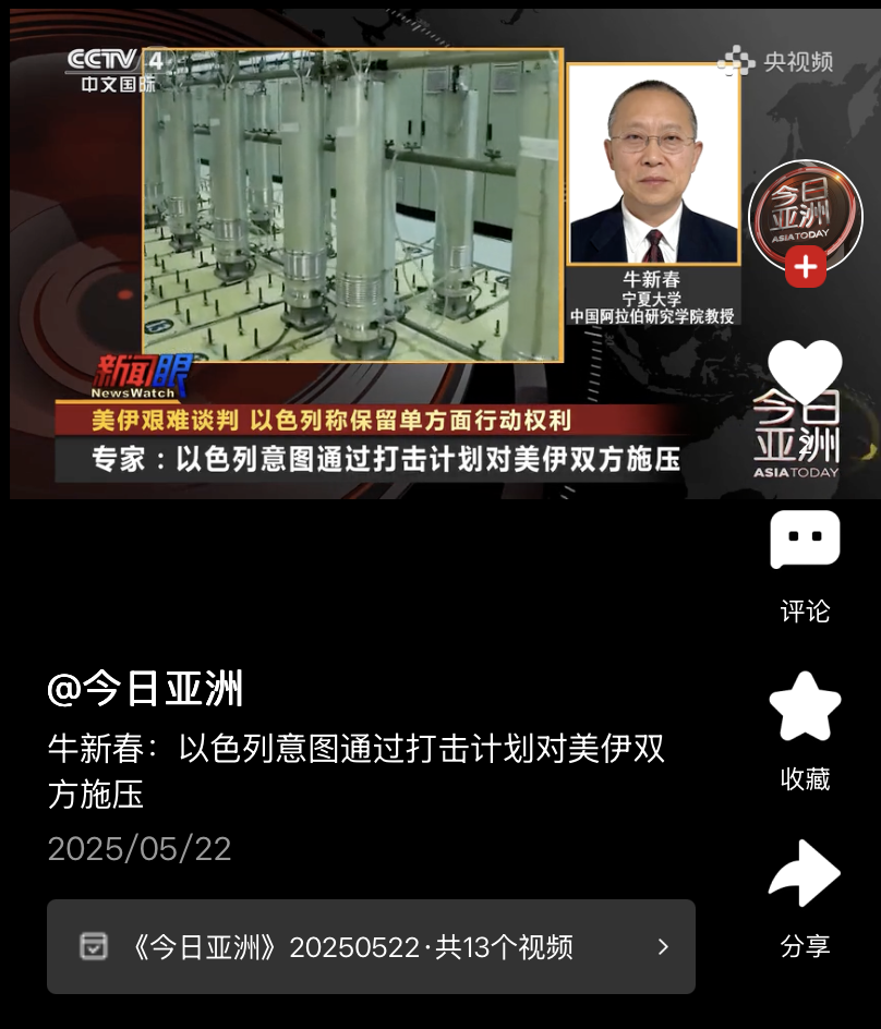 2025年5月19日至5月27日,真人娱乐城 学术副校长、中国阿拉伯国家研究院执行院长,中国中东学会副会长、中国人民外交学会理事牛新春教授接受了中央电视台、中央广播电台、东方卫视、湖北卫视、凤凰卫视等主流媒体的采访和访谈,就当前局势及趋势进行了分析和解读,并应邀进行了专题讲座;除此之外,牛校长在《光明日报》、《世界知识》等期刊杂志发表了文章。