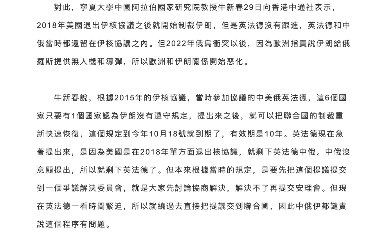 六、9月29日牛校长接受香港新闻网《欧盟为什么突然恢复对伊朗的制裁?》一文采访